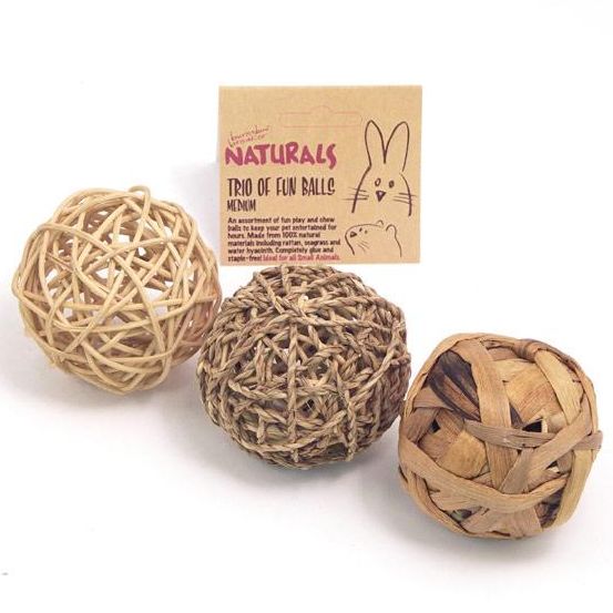 Kolmen lelupallon lajitelma kaneille, marsuille ja muille jyrsijöille. Jokaisessa paketissa on yksi rottingista, vesihyasintista ja luonnon meriheinästä valmistettu pallo. Anna eläinten nakerrella ja heitellä palloa tai pujota herkkuja pallojen sisään. Kaikki pallot ovat turvallisia myös syödä.