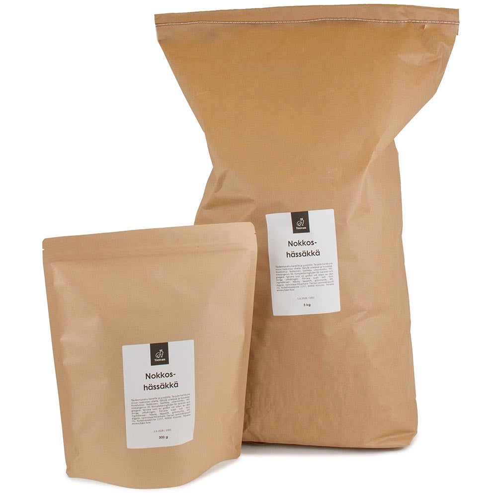 Nokkoshässäkän yrtit ovat paloina tai rouheena, sekä mukana on myös nokkosen varsia. Vähintään puolet pussista on nokkosta. Nokkonen voi kuivattunakin pistellä ihmisen ihoa, mutta on eläimille turvallista silti syödä.