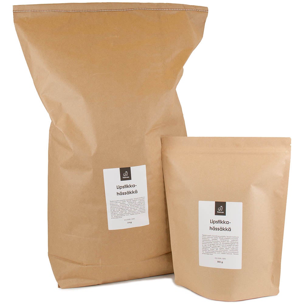 Tierran kotimainen Lipstikkahässäkkä on yrttisekoitus kaneille ja marsuille, sekä gerbiileille, hiirille ja hamstereille. Vain kotimaisista yrteistä valmistettu hässäkkä sopii myös omistajan syötäväksi, sillä yrtit on elintarvikelaatua. Tuoksuva seos sopii sellaisenaan annettavaksi, heinien sekaan ripoteltavaksi tai virikkeisiin piilotettavaksi. Mukana on hieman varsiakin, mutta pääasiassa seos on rouhemaista.